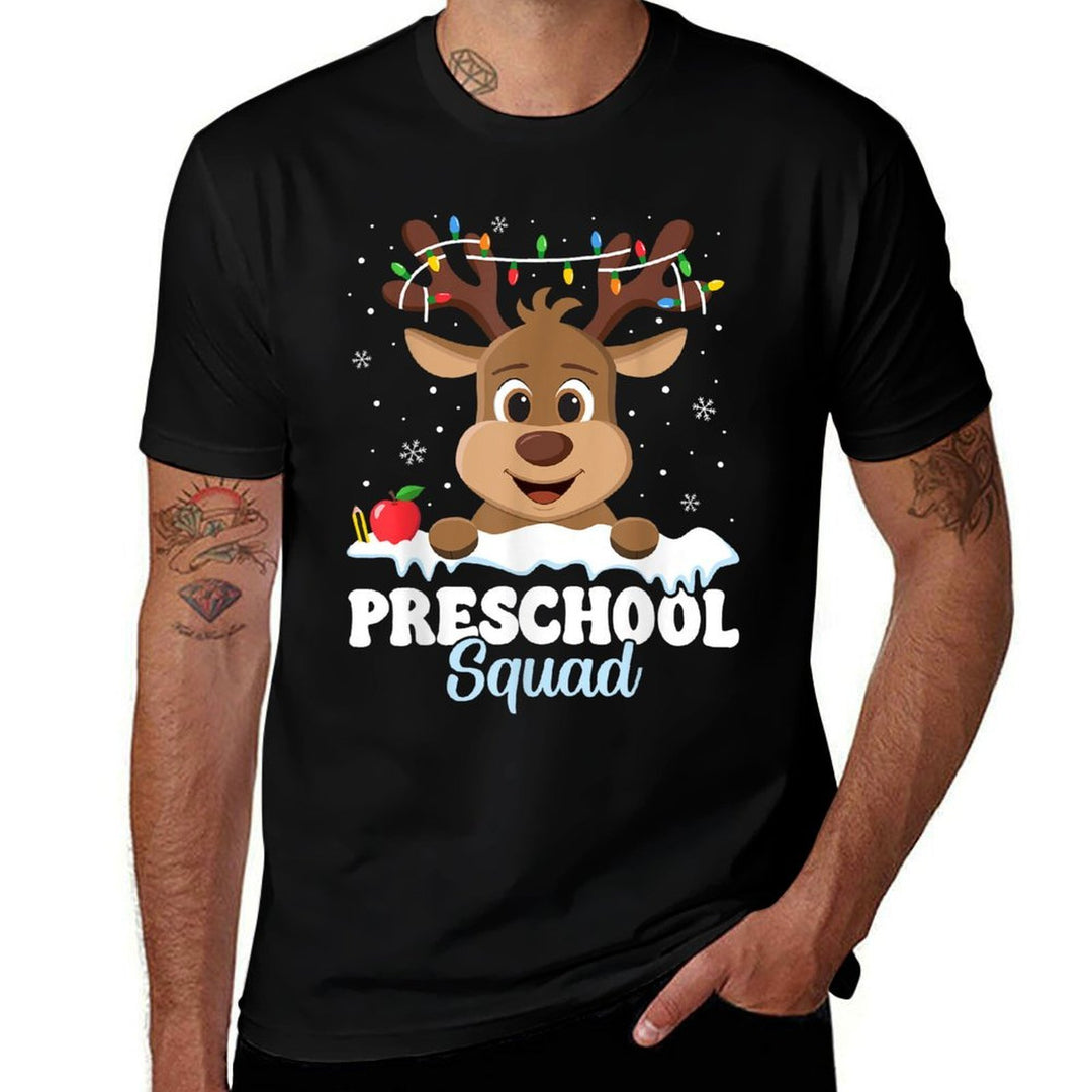 Preschool Teacher Christmas Preschool Squad Reindeer Xmas Ribbed Collar T-Shirt