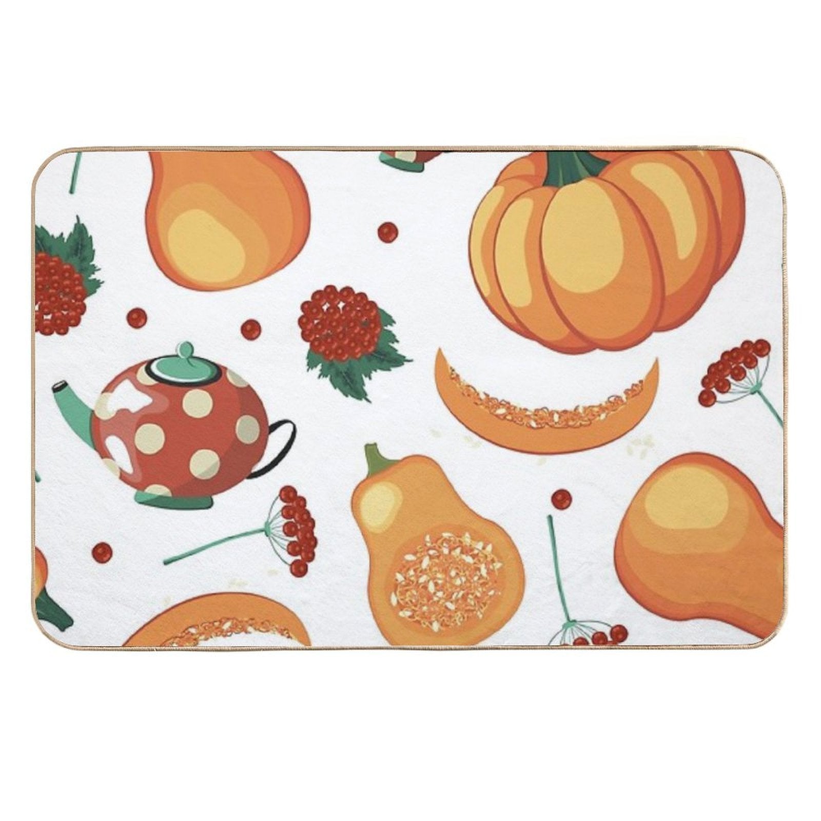 - Use as a vanity rug, guest suite accent, or mudroom defender – the Autumn-Themed Seamless Pattern Featuring Pumpkins, Viburnum Twigs, Teapot, Tea Cup And Plate with Rose Hips Mat adapts to any space.