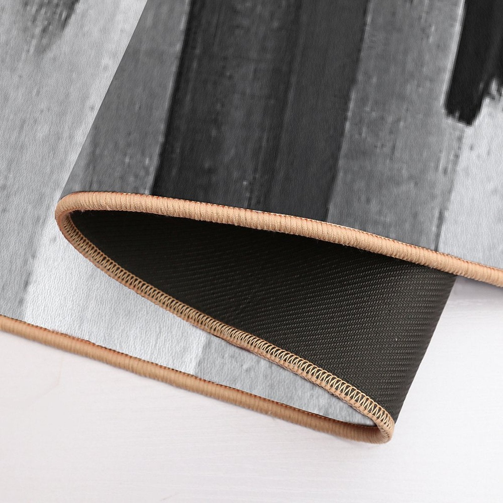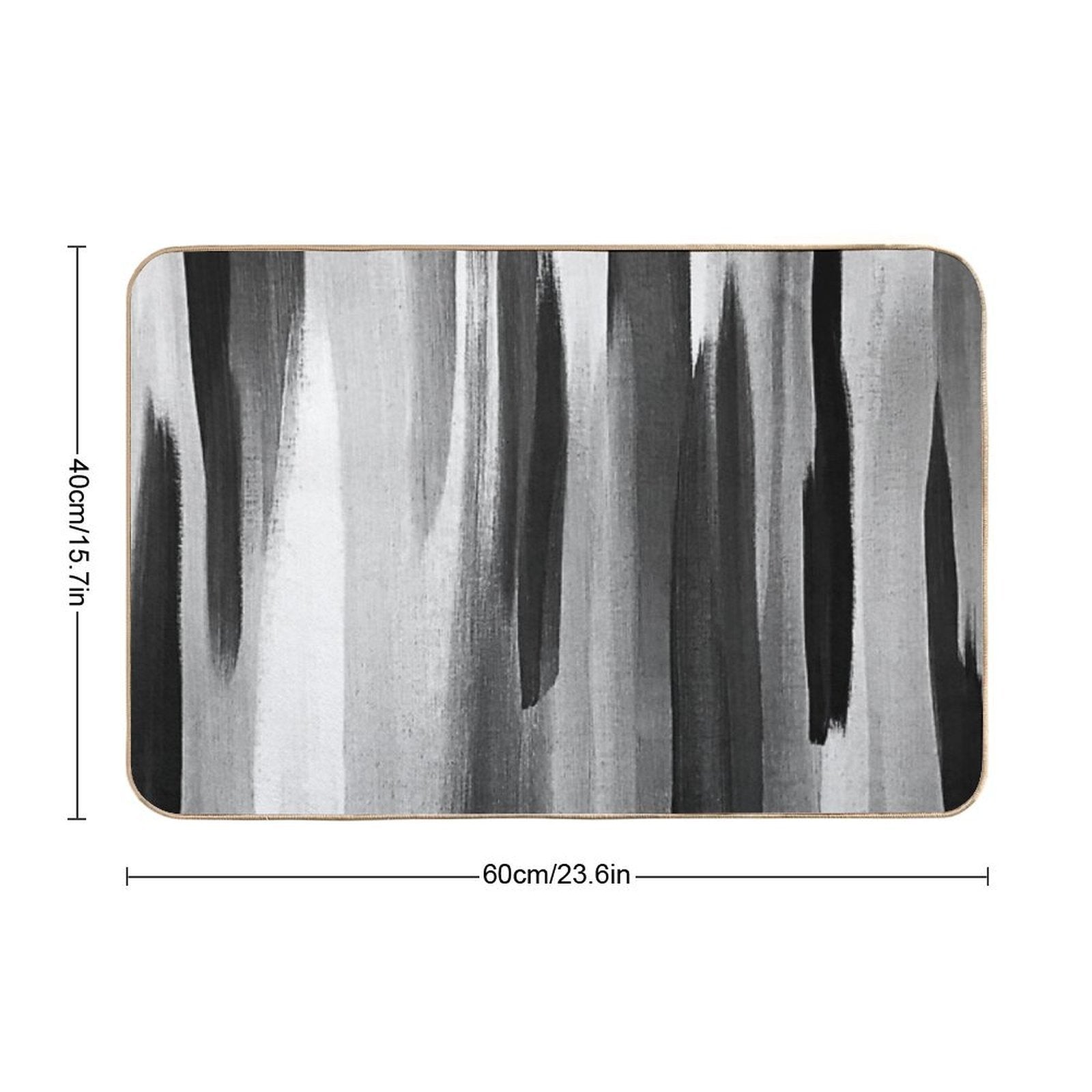 • Non-slip rubber backing grips floors securely, ideal for Contemporary Modern Black, White And Gray Abstract Streaks Mat placements on tiles, wood, or marble.