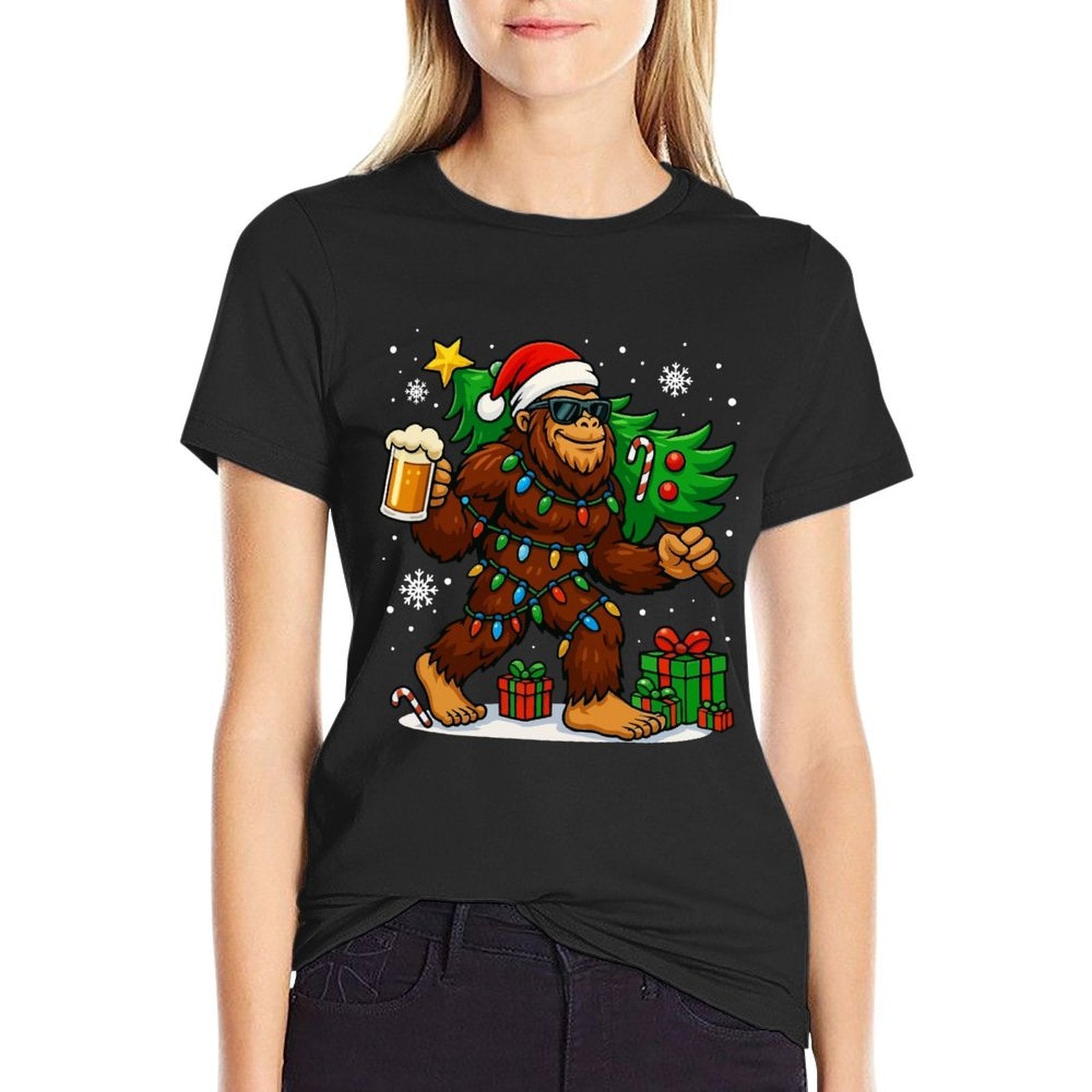 Funny Bigfoot Santa Christmas Tree Drink Beer Xmas Sasquatch Comfortable T-Shirt