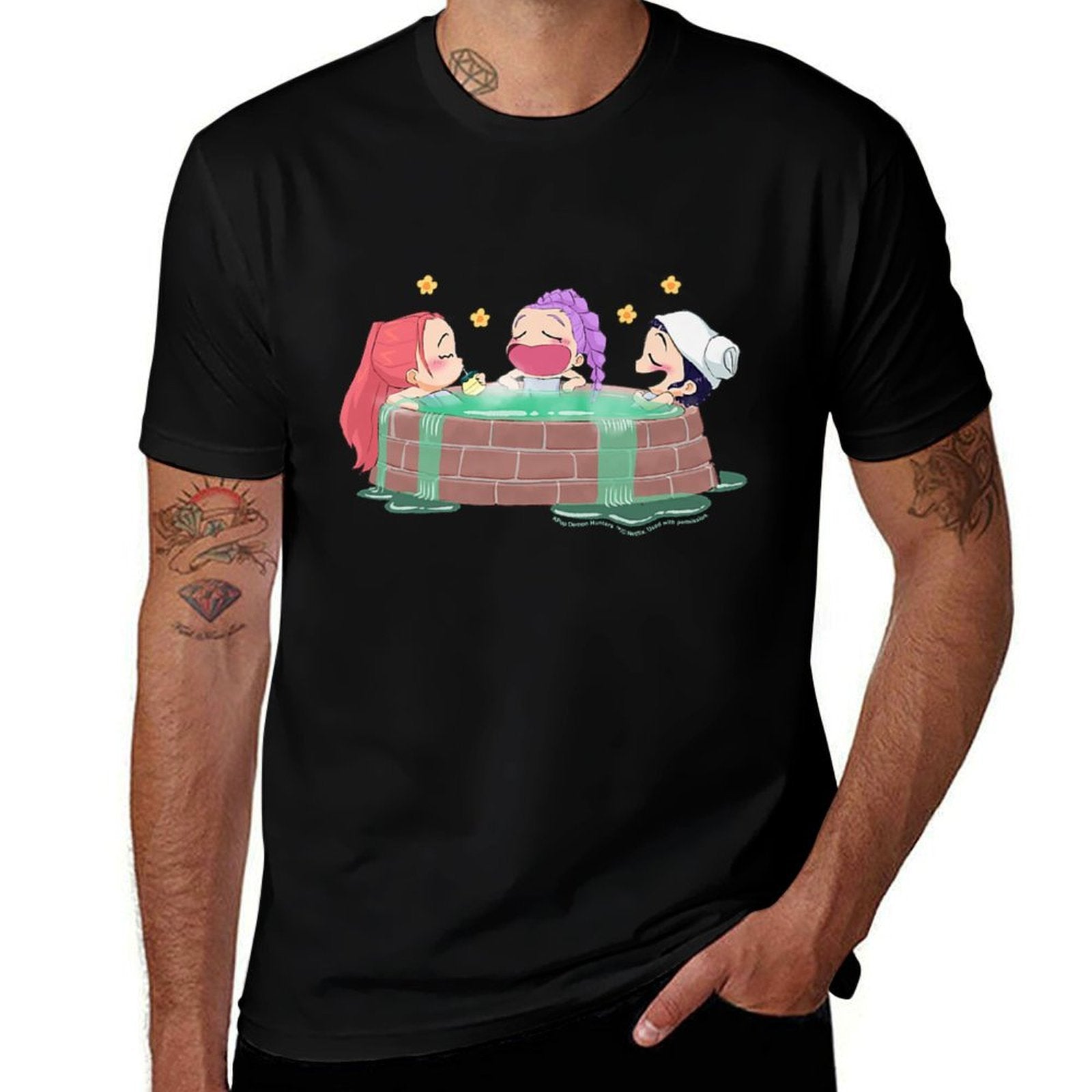 - Care Reminder: Skip soaking and bleach to extend your Kpop Demon Hunters Mira Rumi Zoey Relaxing in Hot Tub Premium tee’s lifespan.
