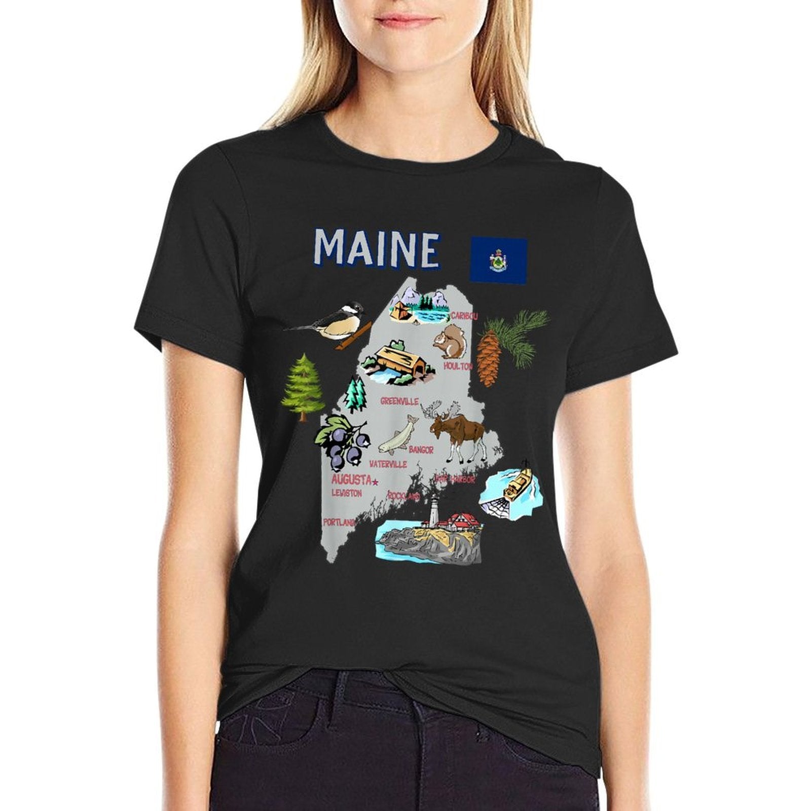 Map of Maine State, Landmarks, Major Cities, Flag, USA Fade-proof Color T-Shirt