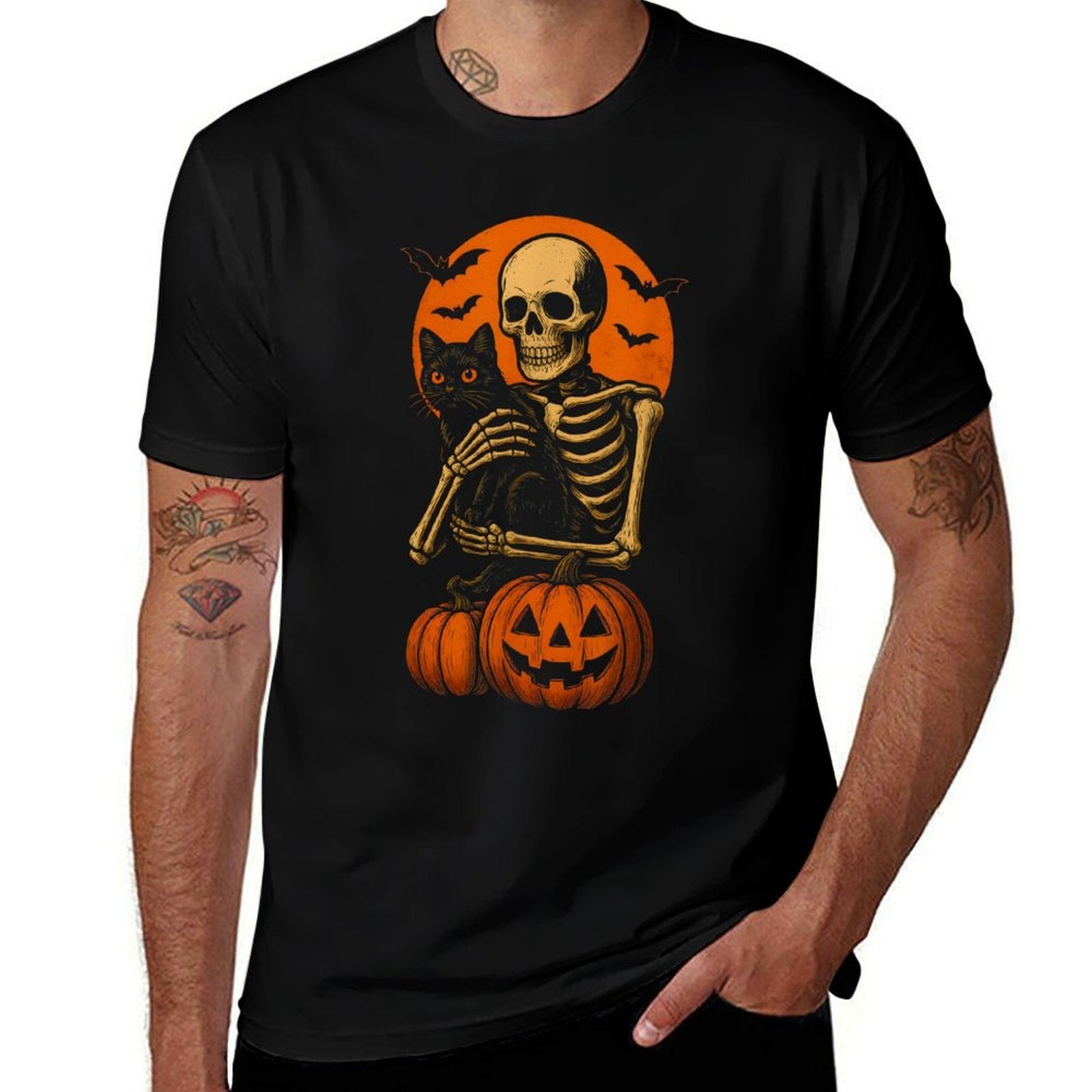 Skeleton And Cute Cat Black Kitten for Halloween Costume  Trendy Pattern T-Shirt