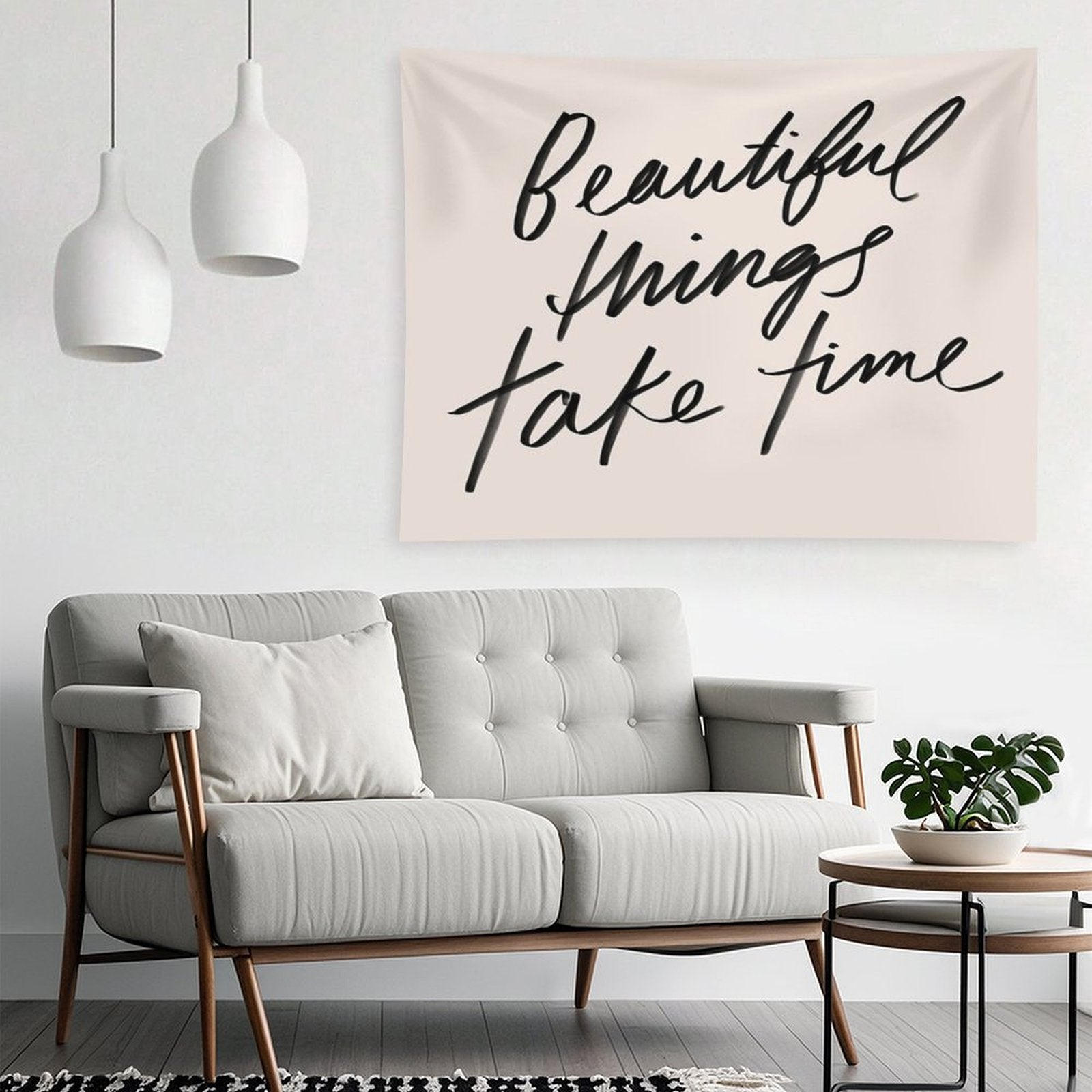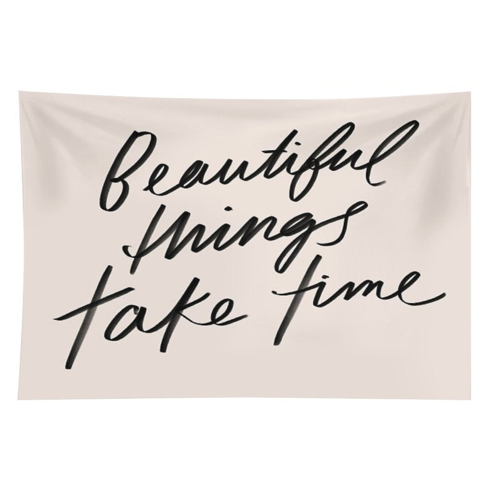 BionZax's Beautiful Things Take Time - Inspirational Quote, Hand-lettering Simple Lettering by Morgan Harper Nichols, MHN Tapestry for Bedroom, College Dorm. Beautiful Things Take Time - Inspirational Quote, Hand-lettering Simple Lettering by Morgan Harper Nichols, MHN Tapestry to decorate your bedroom, college dorm, living room, or kitchen wall, it is the best gift for funny, meme, aesthetic, trendy, simple, fashion, music, abstract, fantasy, modern tapestry for girls, men, boys, teen, women, kids.