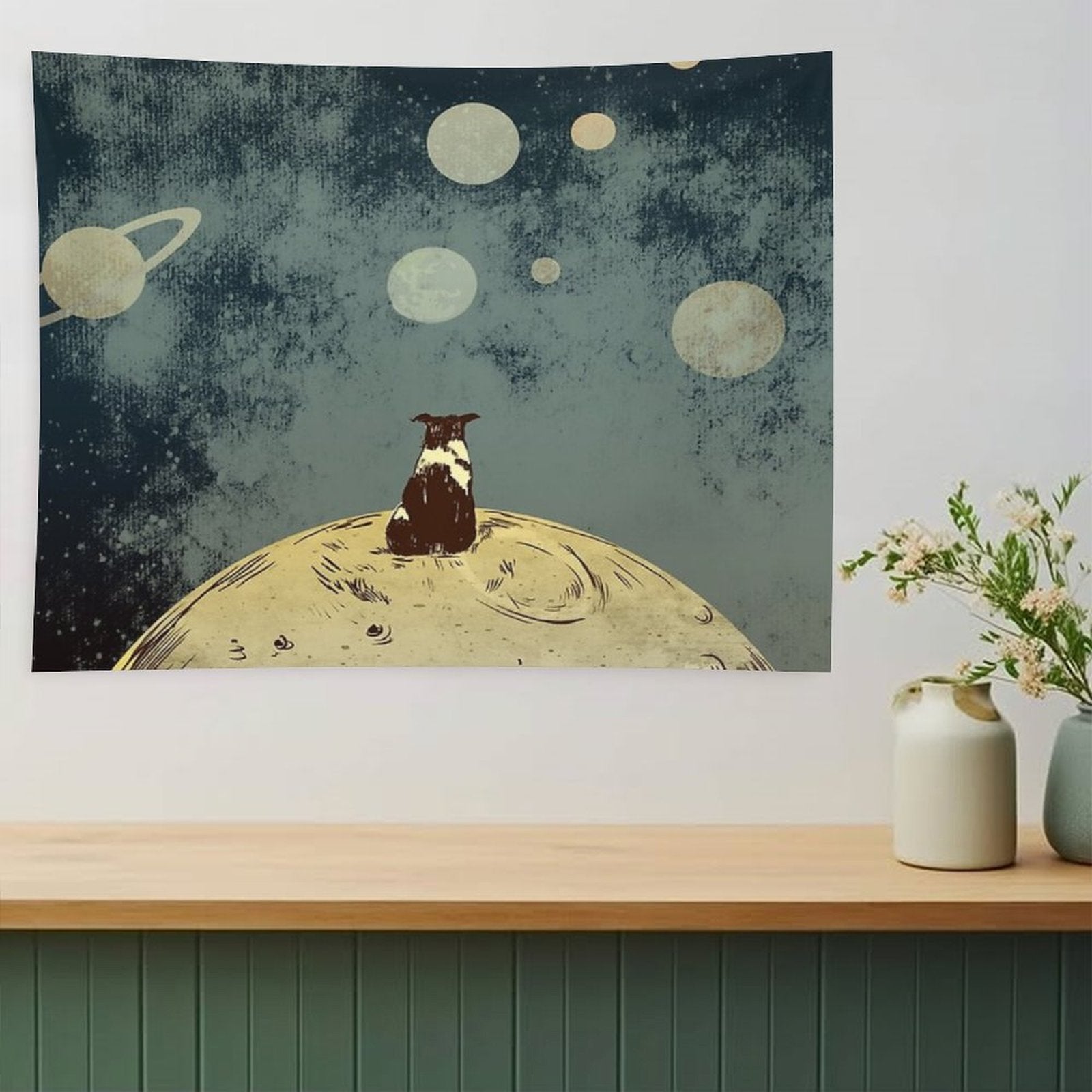 BionZax's Endless Opportunities - Dog Looking Into Space Tapestry for Bedroom, College Dorm. Endless Opportunities - Dog Looking Into Space Tapestry to decorate your bedroom, college dorm, living room, or kitchen wall, it is the best gift for funny, meme, aesthetic, trendy, simple, fashion, music, abstract, fantasy, modern tapestry for girls, men, boys, teen, women, kids.