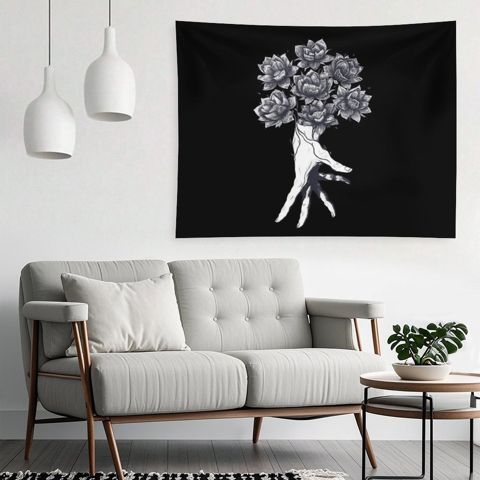 BionZax's Hand with Lotuses on Black Tapestry for Bedroom, College Dorm. Hand with Lotuses on Black Tapestry to decorate your bedroom, college dorm, living room, or kitchen wall, it is the best gift for funny, meme, aesthetic, trendy, simple, fashion, music, abstract, fantasy, modern tapestry for girls, men, boys, teen, women, kids.