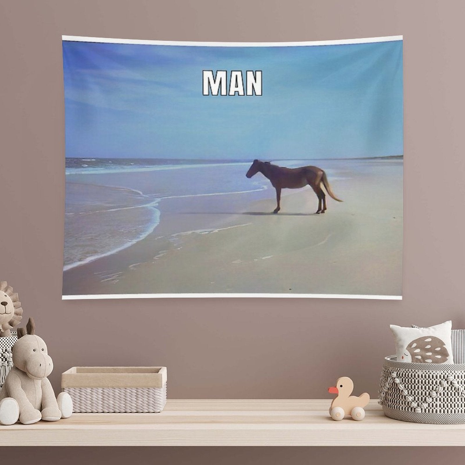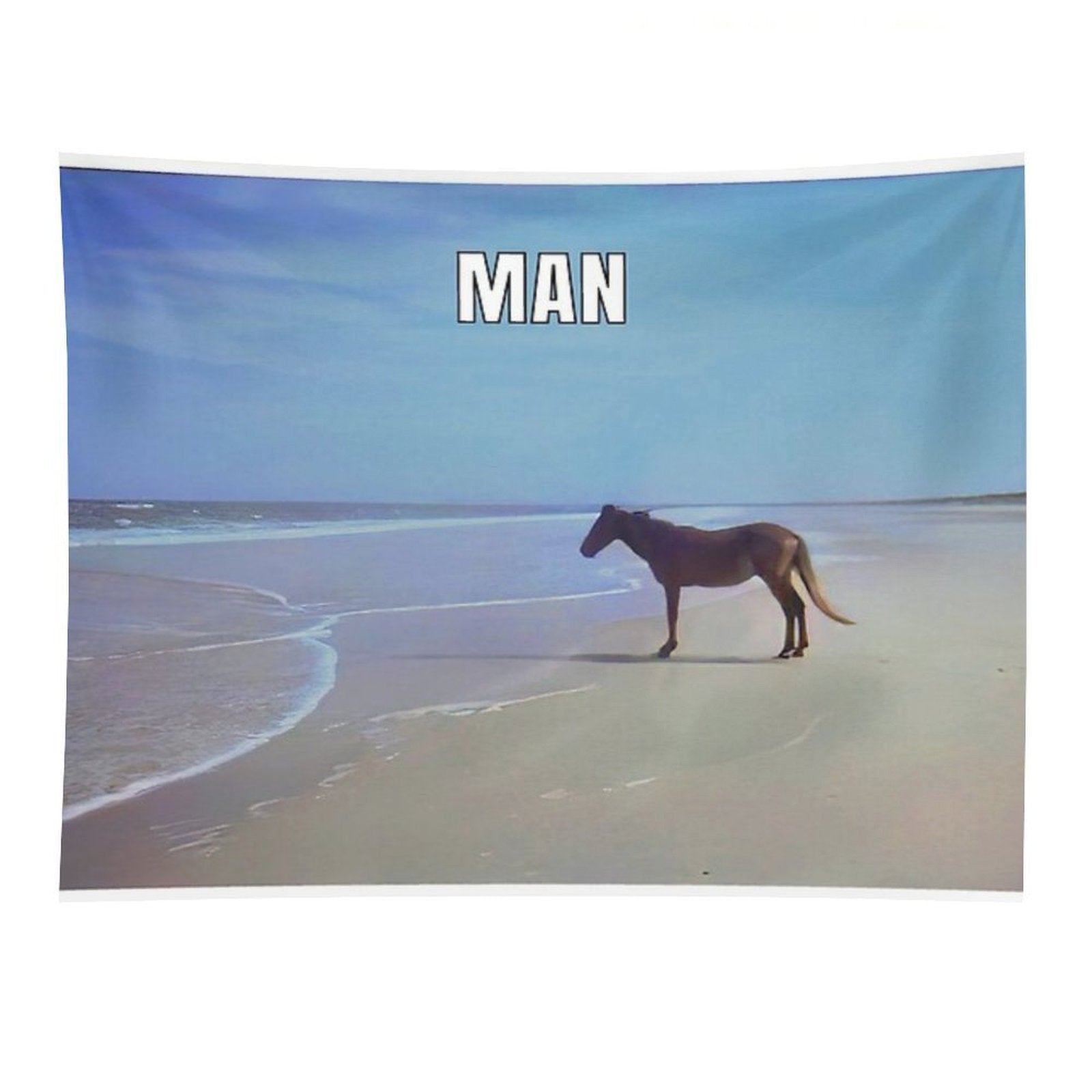 BionZax's Man ♞ HD Horse on Beach Meme Tapestry for Bedroom, College Dorm. Man ♞ HD Horse on Beach Meme Tapestry to decorate your bedroom, college dorm, living room, or kitchen wall, it is the best gift for funny, meme, aesthetic, trendy, simple, fashion, music, abstract, fantasy, modern tapestry for girls, men, boys, teen, women, kids.