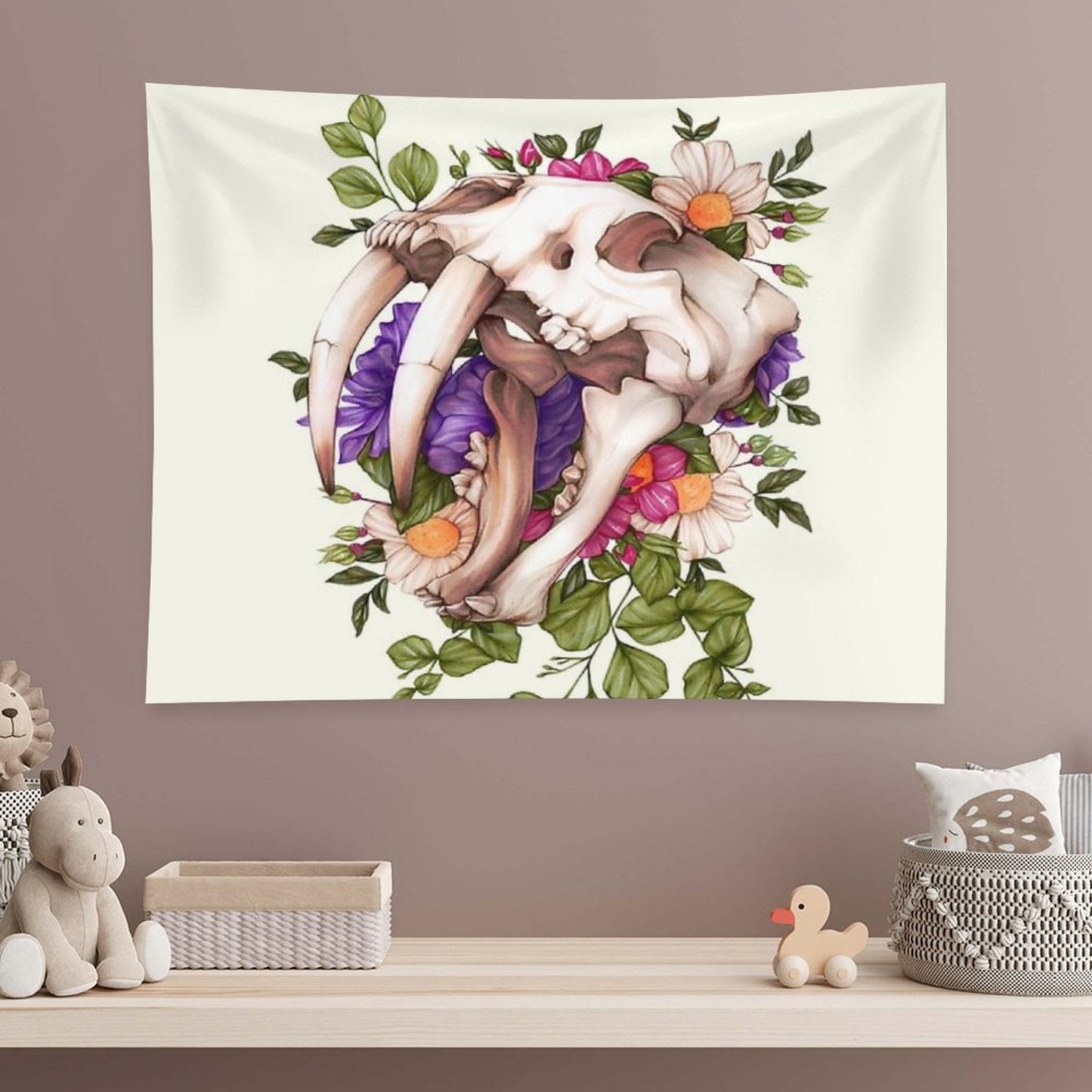 BionZax's Sabertooth Skull Tapestry for Bedroom, College Dorm. Sabertooth Skull Tapestry to decorate your bedroom, college dorm, living room, or kitchen wall, it is the best gift for funny, meme, aesthetic, trendy, simple, fashion, music, abstract, fantasy, modern tapestry for girls, men, boys, teen, women, kids.
