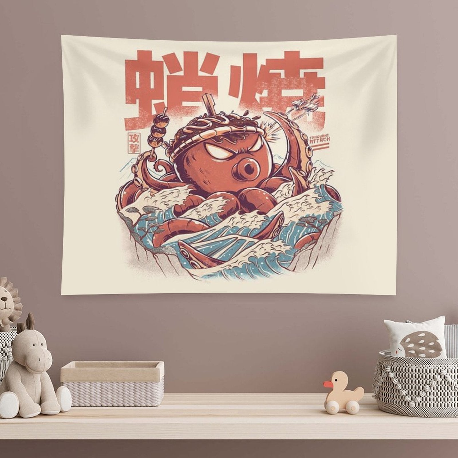 BionZax's Takoyaki Attack Tapestry for Bedroom, College Dorm. Takoyaki Attack Tapestry to decorate your bedroom, college dorm, living room, or kitchen wall, it is the best gift for funny, meme, aesthetic, trendy, simple, fashion, music, abstract, fantasy, modern tapestry for girls, men, boys, teen, women, kids.