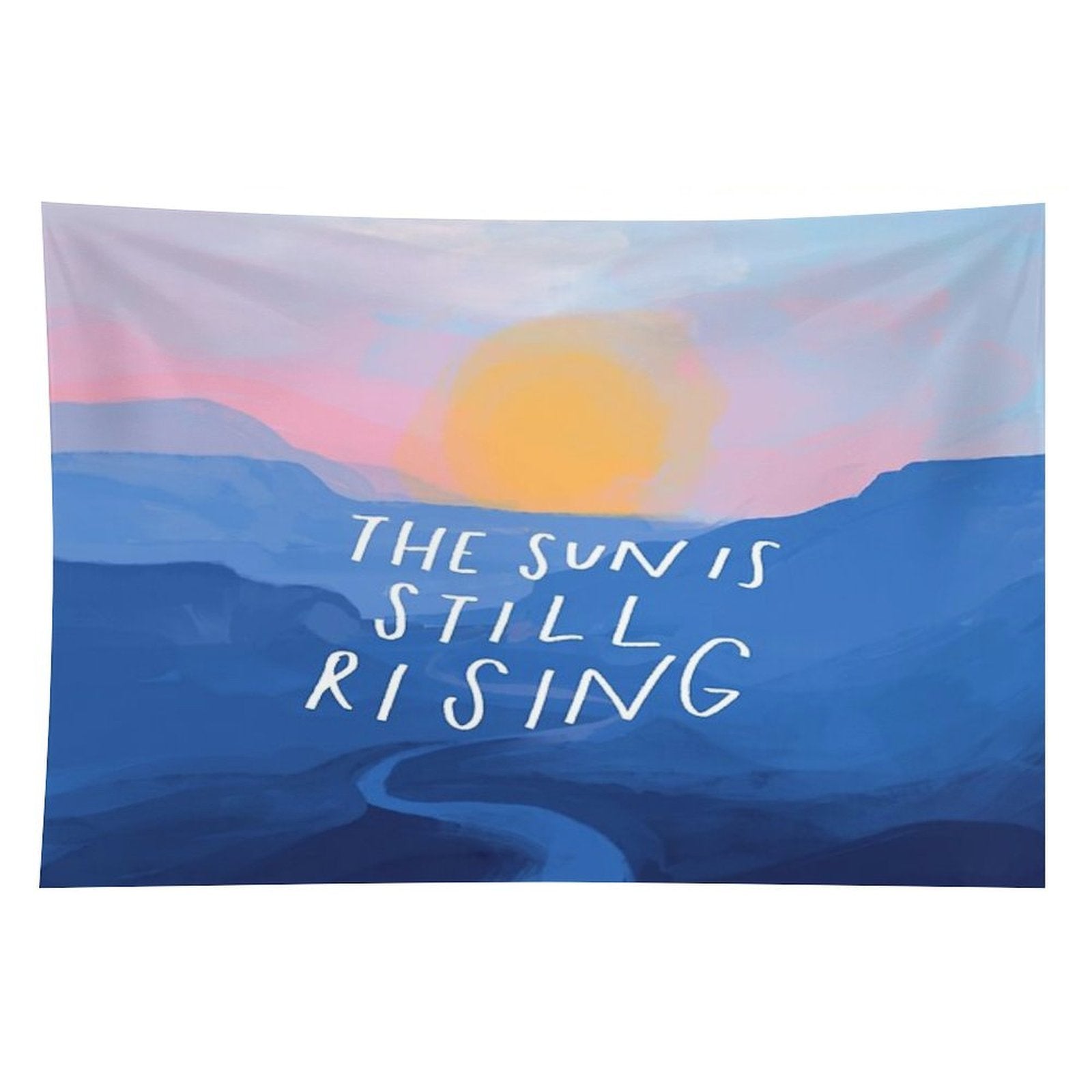 BionZax's The Sun Is Still Rising - Inspirational Quote And Abstract Blue Mountain Sunrise Landscape - Painted by Morgan Harper Nichols Tapestry for Bedroom, College Dorm. The Sun Is Still Rising - Inspirational Quote And Abstract Blue Mountain Sunrise Landscape - Painted by Morgan Harper Nichols Tapestry to decorate your bedroom, college dorm, living room, or kitchen wall, it is the best gift for funny, meme, aesthetic, trendy, simple, fashion, music, abstract, fantasy, modern tapestry for girls, men, boys, teen, women, kids.