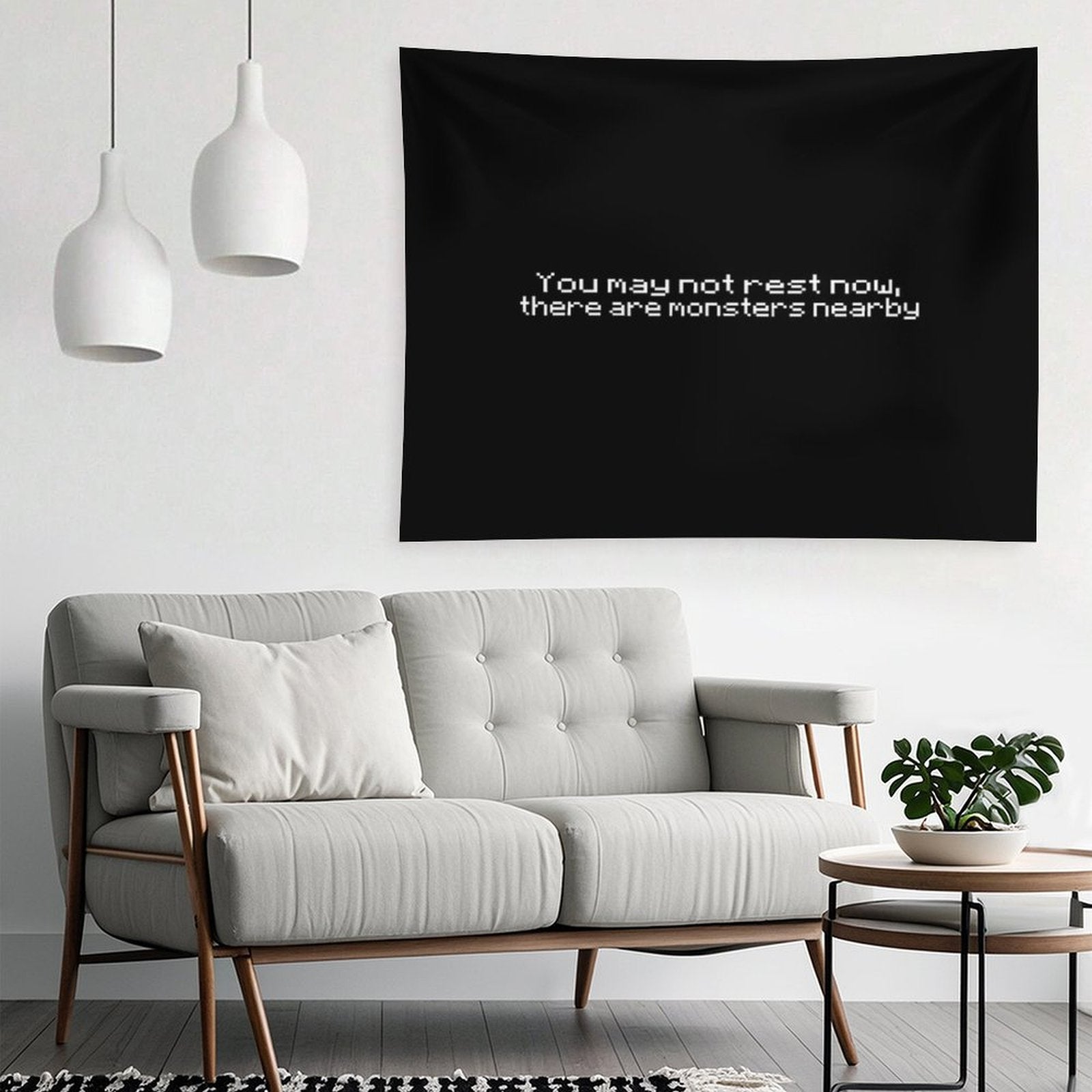 BionZax's You May Not Rest Now, There Are Monsters Nearby Tapestry for Bedroom, College Dorm. You May Not Rest Now, There Are Monsters Nearby Tapestry to decorate your bedroom, college dorm, living room, or kitchen wall, it is the best gift for funny, meme, aesthetic, trendy, simple, fashion, music, abstract, fantasy, modern tapestry for girls, men, boys, teen, women, kids.