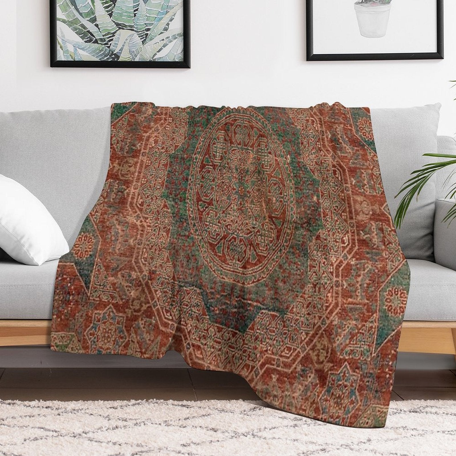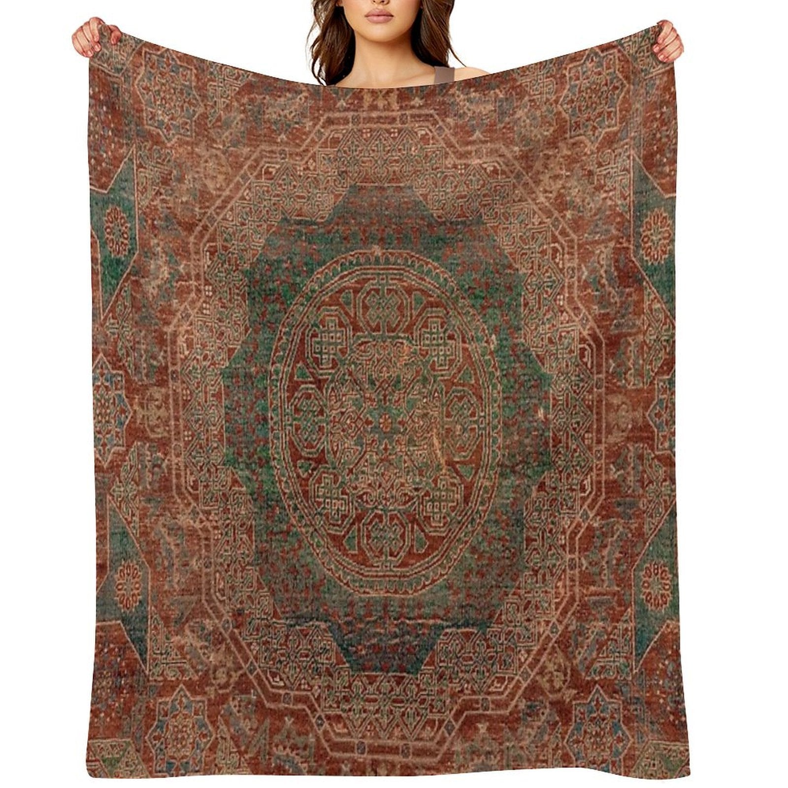 Bohemian Medallion I 15th Century Old Distressed Red Green Colorful Ornate Accent Rug Pattern Versatility Throw Blanket
