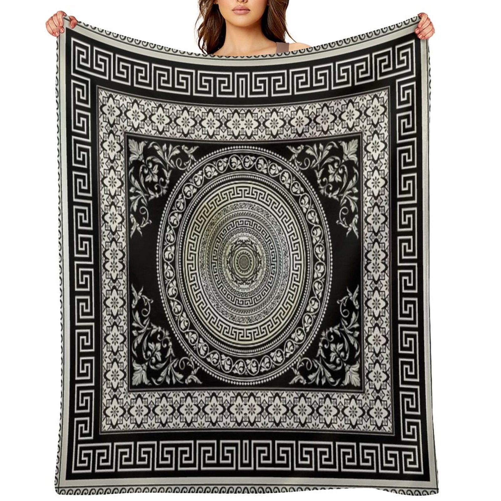 Greek Key Meander Black Cream Ornate Medallion Machine-washable Throw Blanket