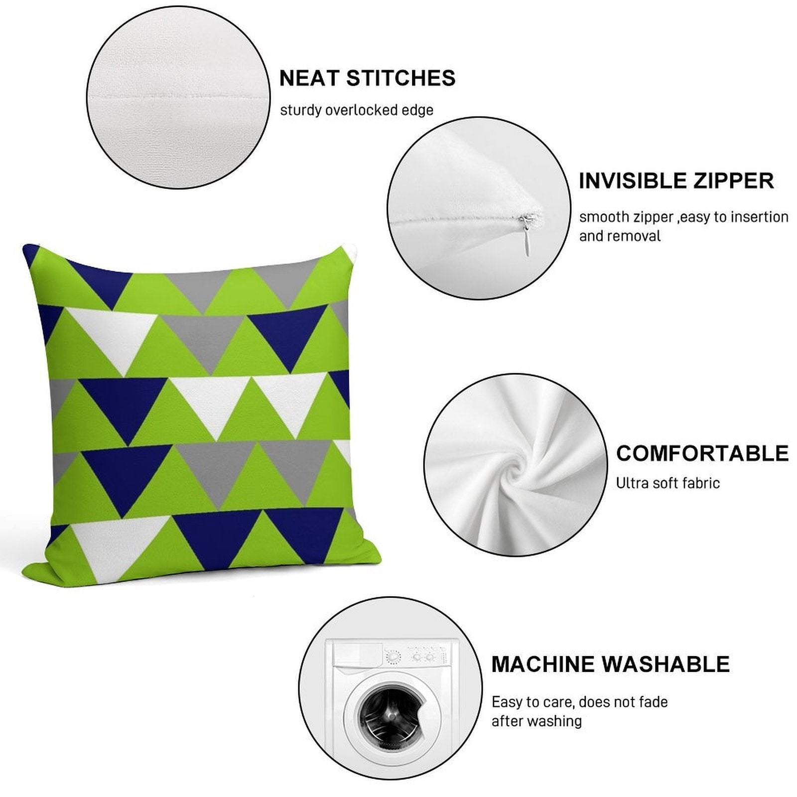 • Reinforced stitching along the edges prevents fraying and extends the life of your Arrows Lime Green, Bright Navy Blue, Grey, And White Pillowcase.