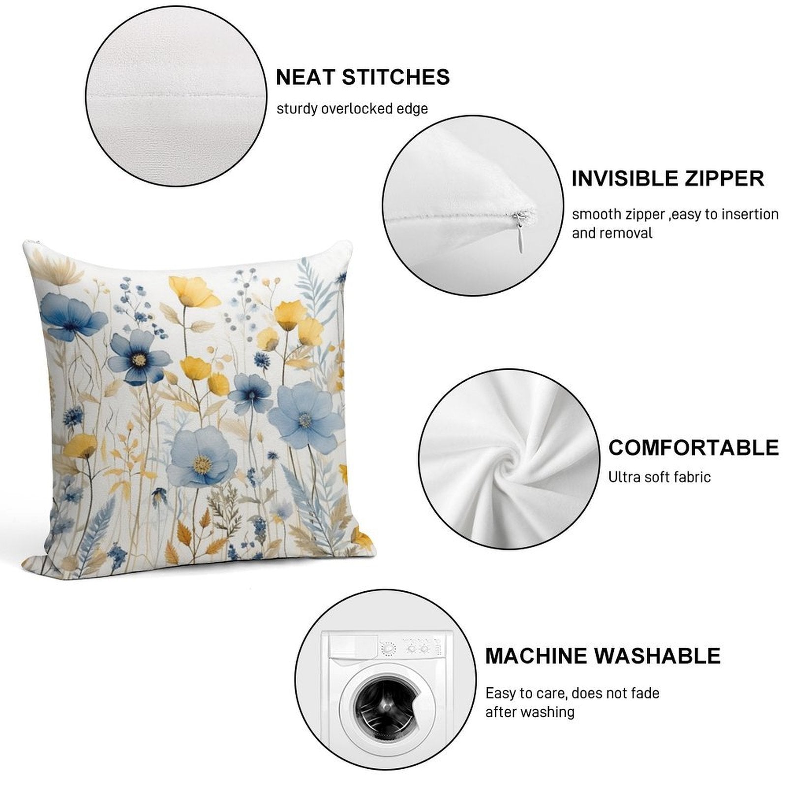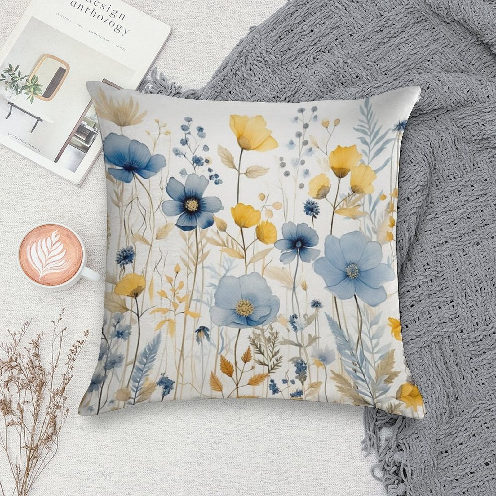 Blue And Yellow Wildflowers, Watercolour Boho Flowers Soft Shrink-Resistant Throw Pillow