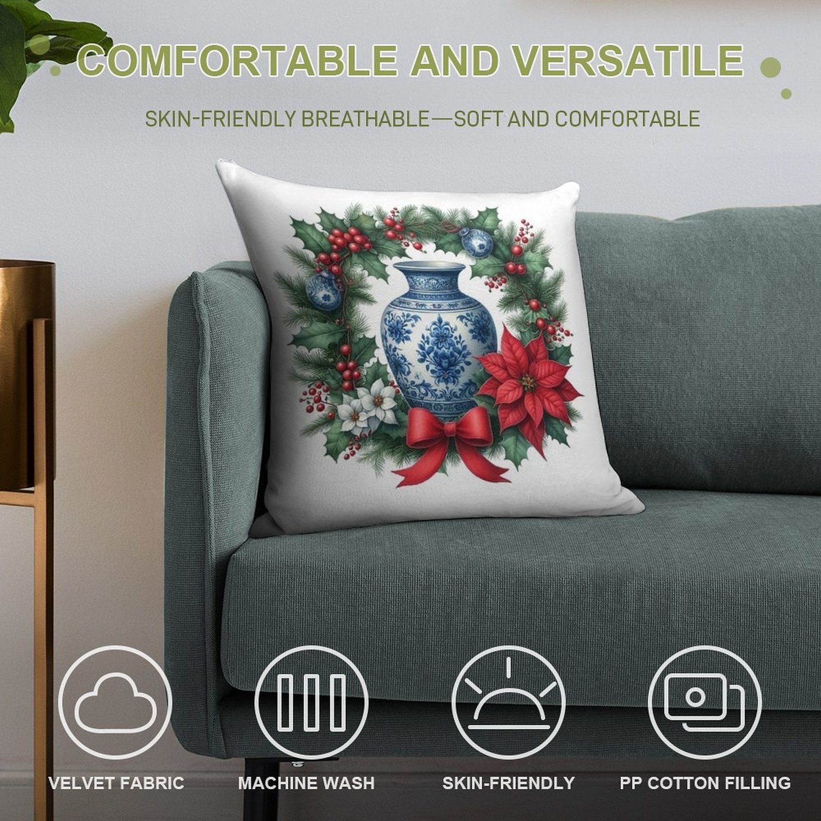 Chinoiserie Christmas Wreath with Blue White Porcelain Ginger Jar Soft Luxury Feel Throw Pillow