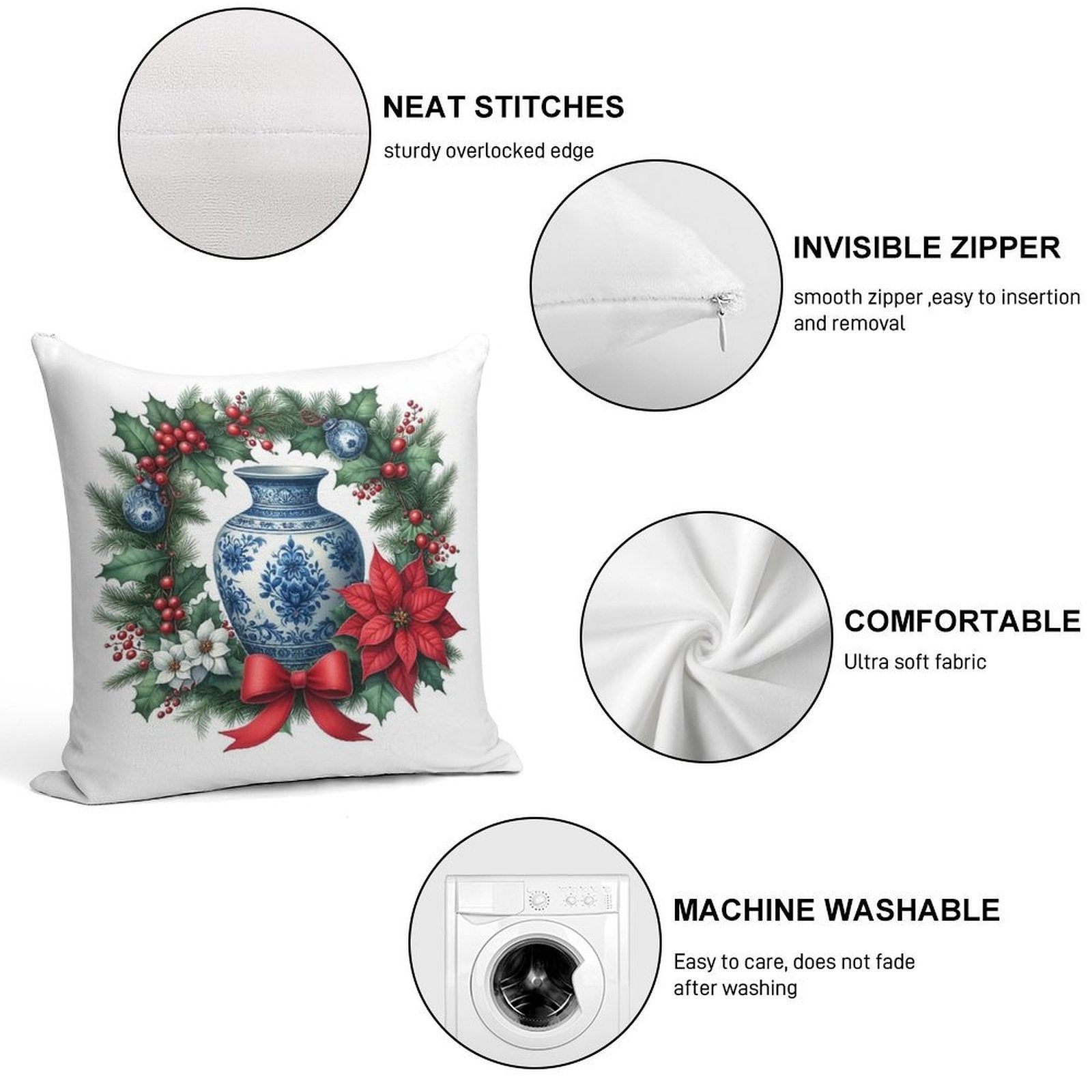 - Reinforced stitching along the edges prevents fraying and extends the life of your Chinoiserie Christmas Wreath with Blue White Porcelain Ginger Jar Pillowcase.