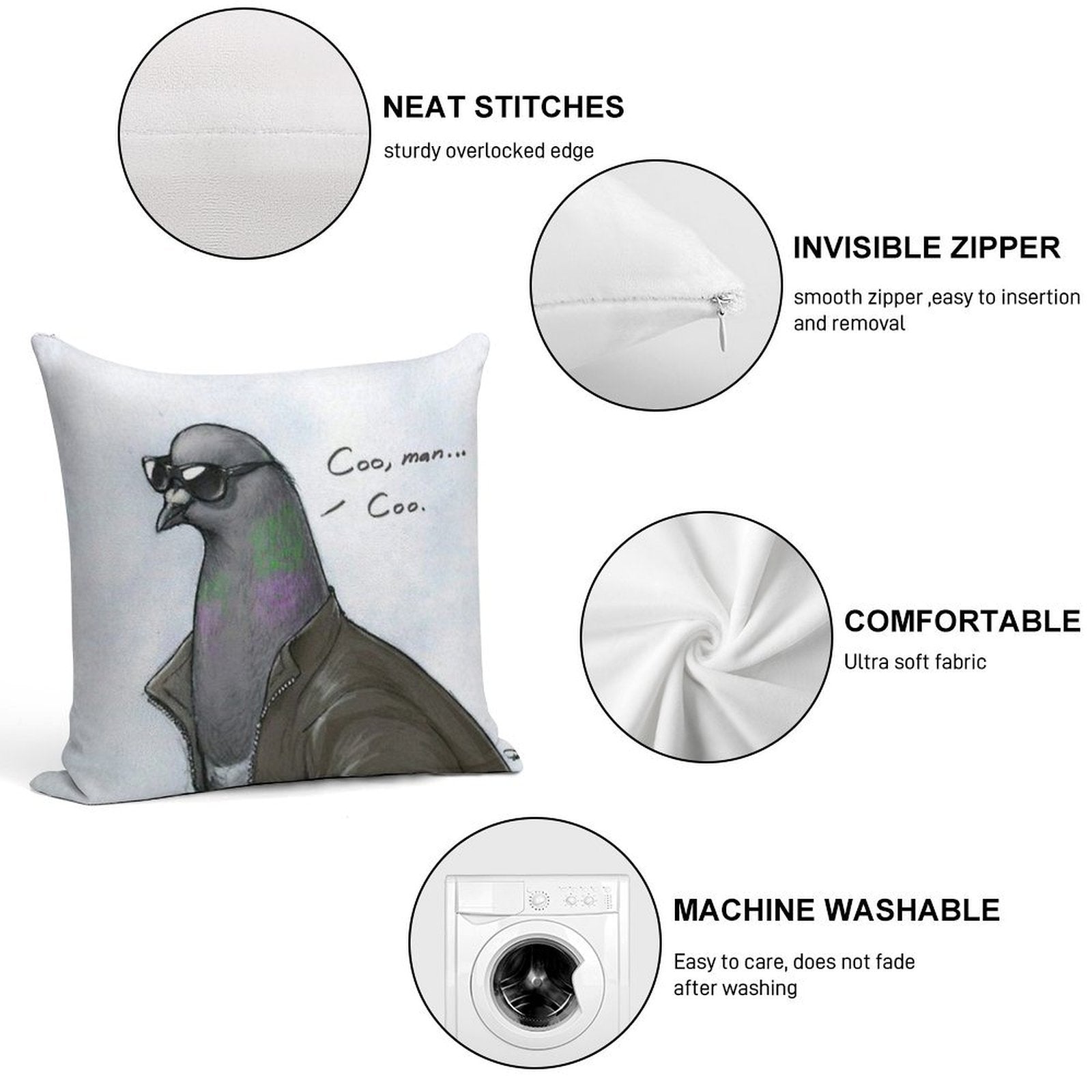 • Reinforced stitching along the edges prevents fraying and extends the life of your Coo' Man, Coo' Pigeon Pillowcase.
