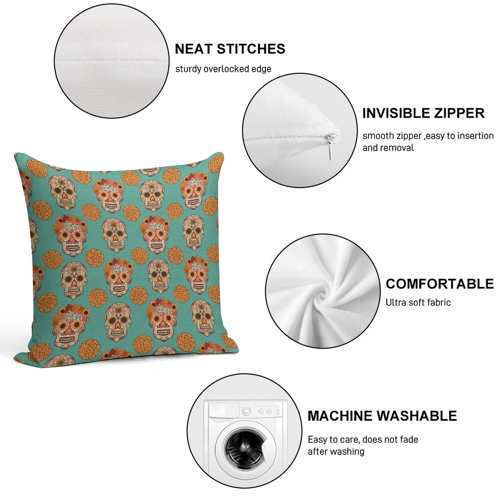 • Reinforced stitching along the edges prevents fraying and extends the life of your Day of The Dead Skulls And Flowers on A Textured Blue Green Background Pillowcase.