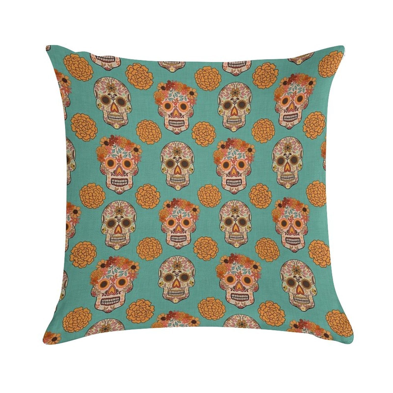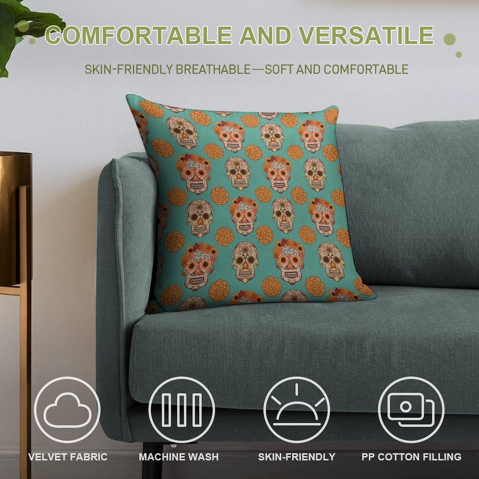 Day of The Dead Skulls And Flowers on A Textured Blue Green Background Soft Durable Construction Throw Pillow