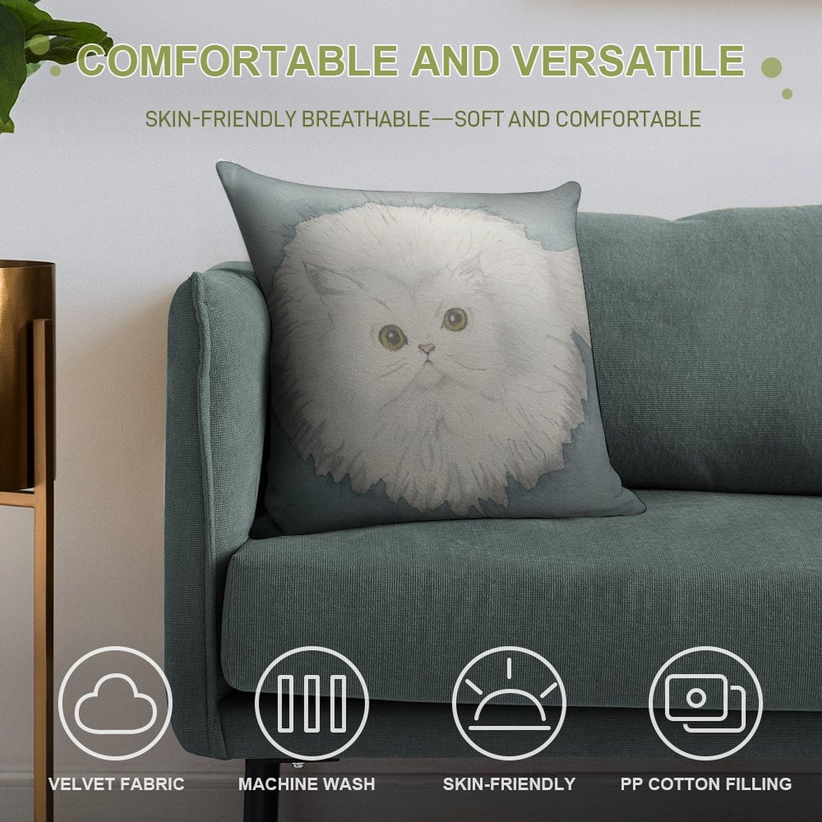 Golden-Eyed Fluffy White Cat – Watercolour Soft Short Plush Fabric Throw Pillow
