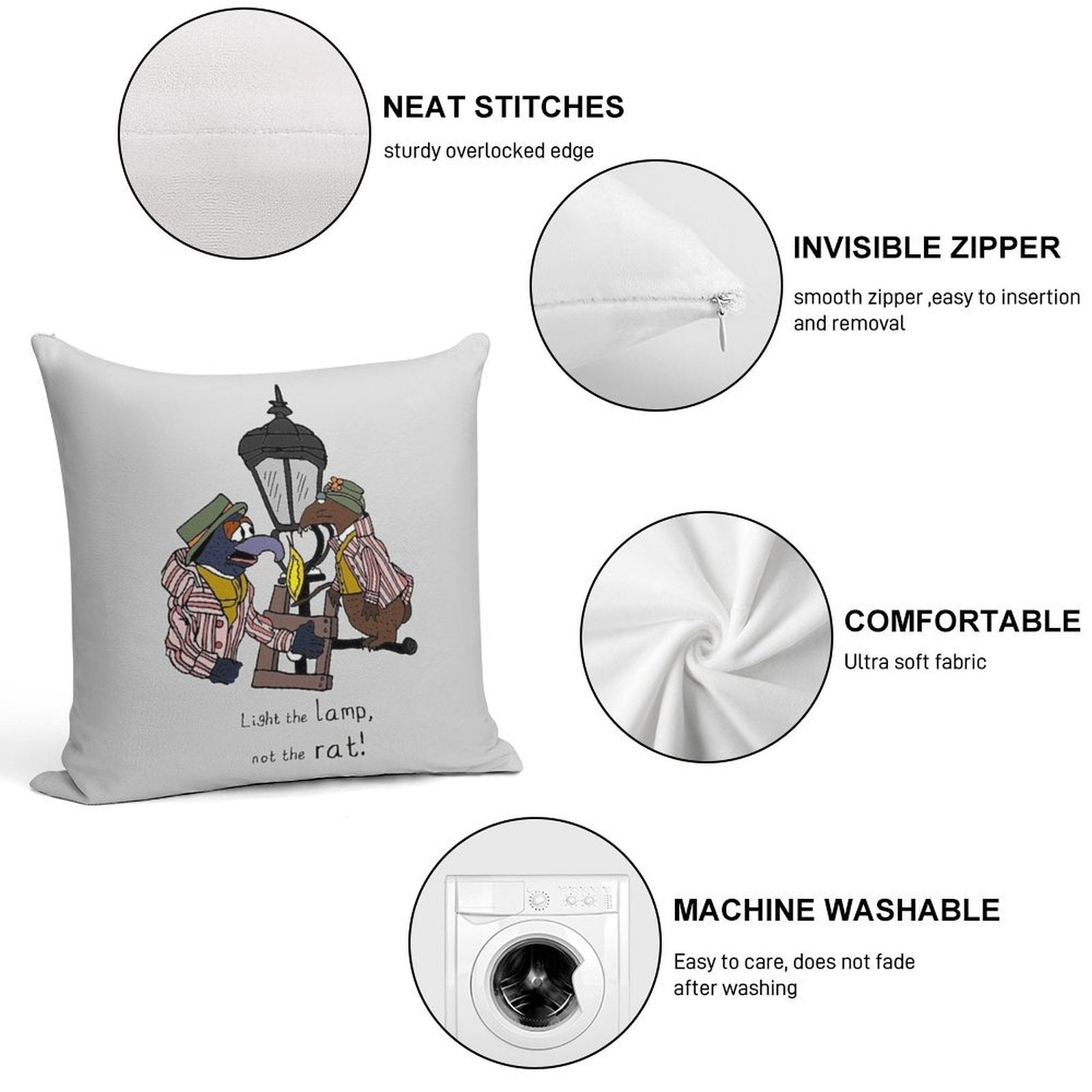 - Reinforced stitching along the edges prevents fraying and extends the life of your Light The Lamp, Not The Rat! (with Full Lamp Post) Pillowcase.