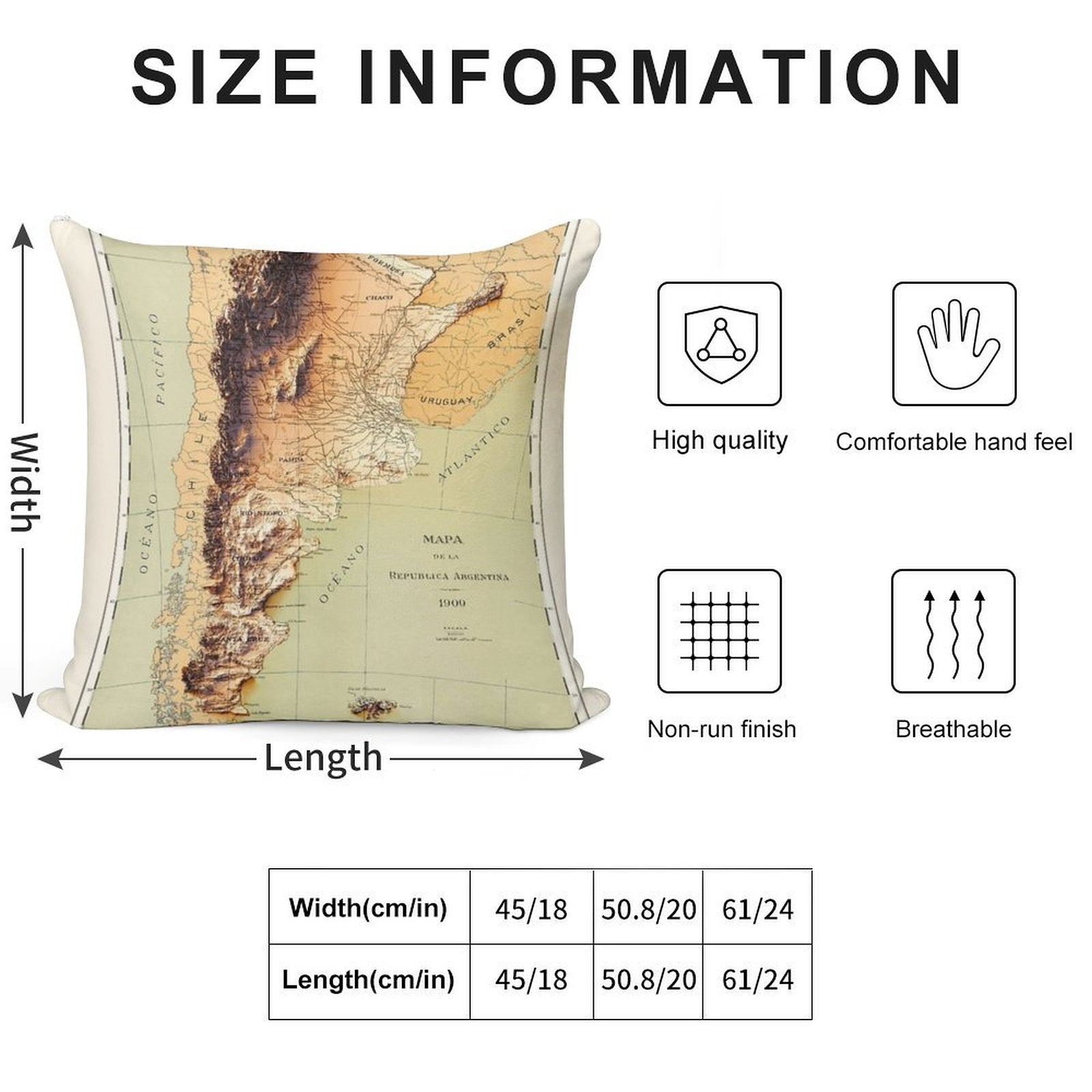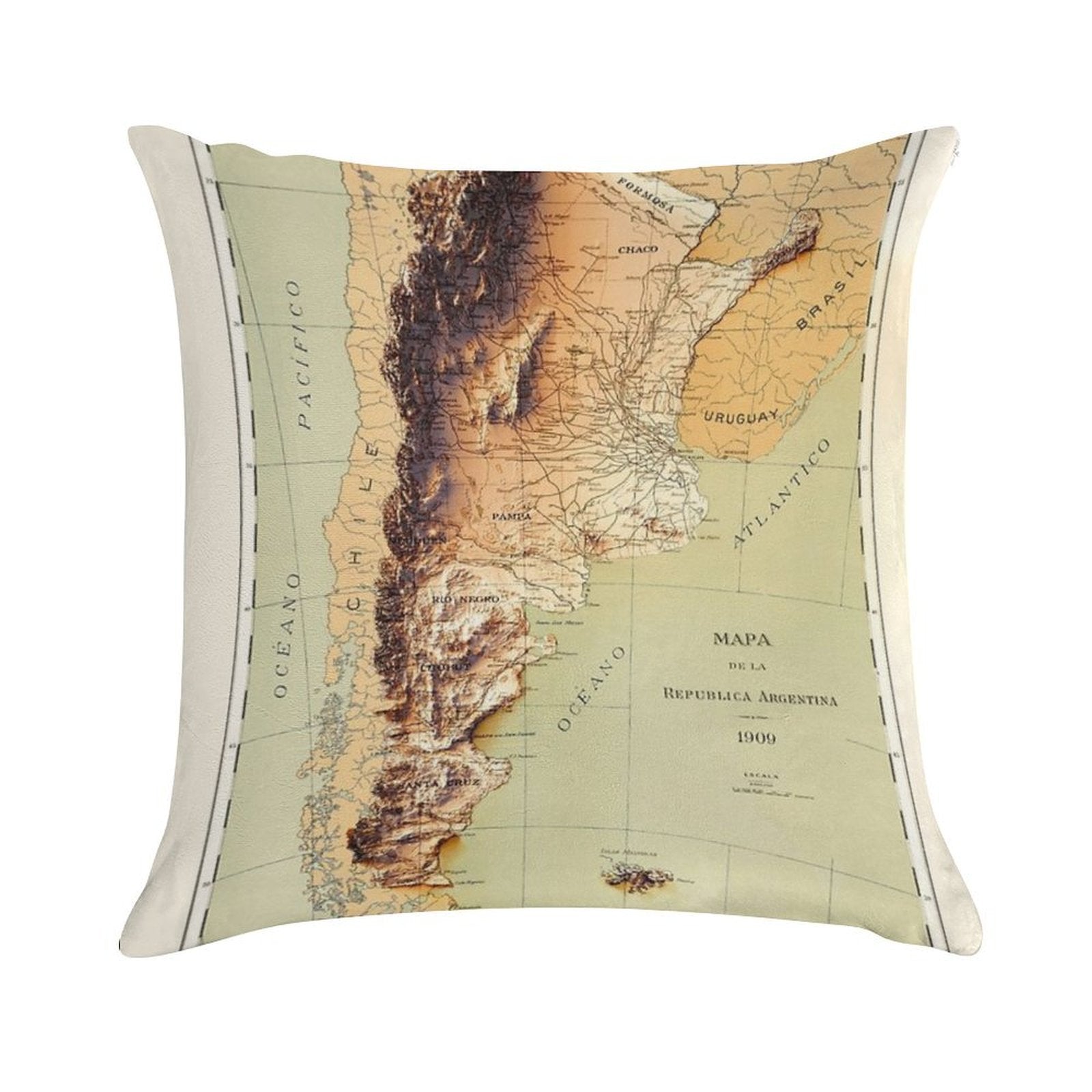 - Reinforced stitching along the edges prevents fraying and extends the life of your 1909 Argentina Relief Map Digitally-rendered Pillowcase.