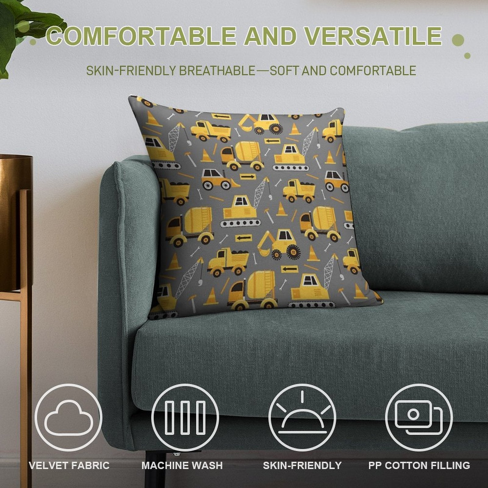 Construction Trucks on Gray Soft Short Plush Fabric Throw Pillow